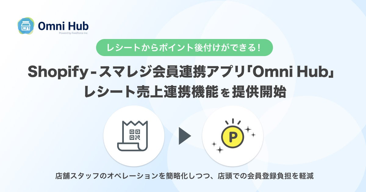 Shopify(ショッピファイ) – スマレジ間のオムニチャネル会員連携アプリ「Omni Hub」(株式会社フィードフォース、所在地:東京都文京区、代表取締役:塚田 耕司)は、店舗で発行するレシート上にQRコードを設置し、それをお客さまが読み込むことで、後から店舗(スマレジ)での購入をShopifyに連携して、ポイントが後からでも獲得できるレシート売上連携機能を公開しました。